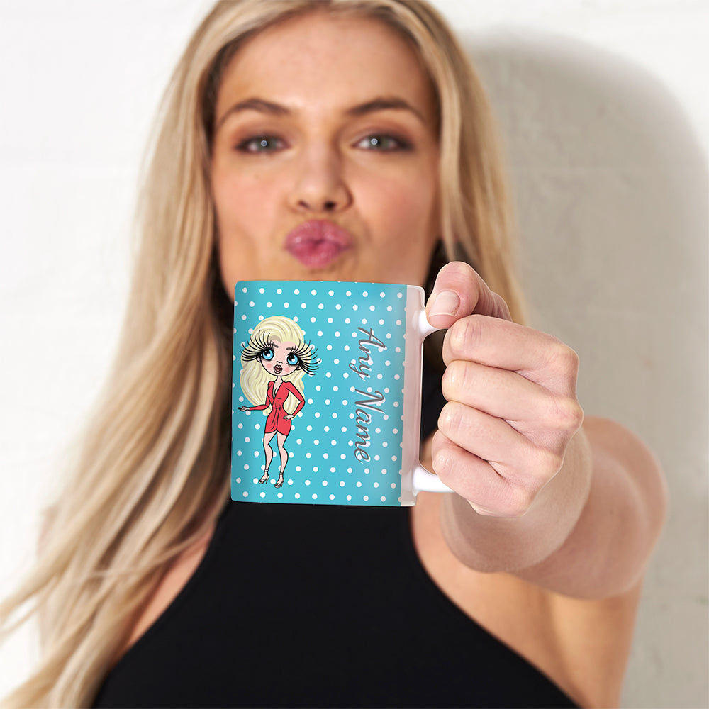 This ClaireaBella Mug is perfect for enjoying your morning brew. Create your ClaireaBella character to represent you or the recipient and see her fabulously appear on a beautiful blue polka dot design with your name and ClaireaBella signature.