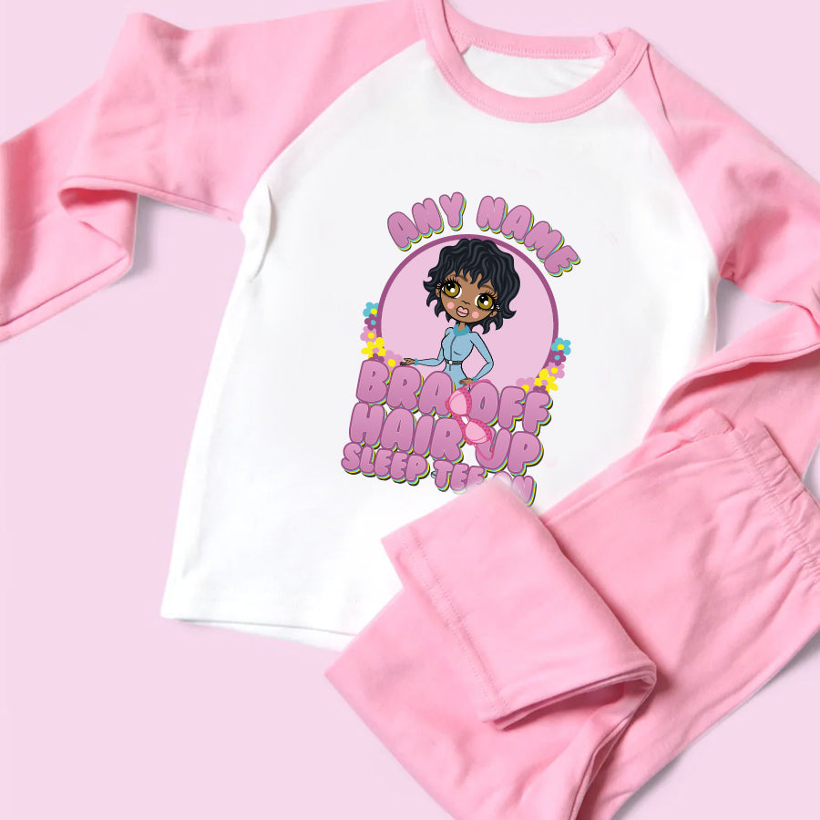 Long days need to end with a lil luxury (minus the bra!) Our sassy ClaireaBella Bra Off Pyjamas! Designed for little dreamers, this super-cute set customised their iconic customised character and name.