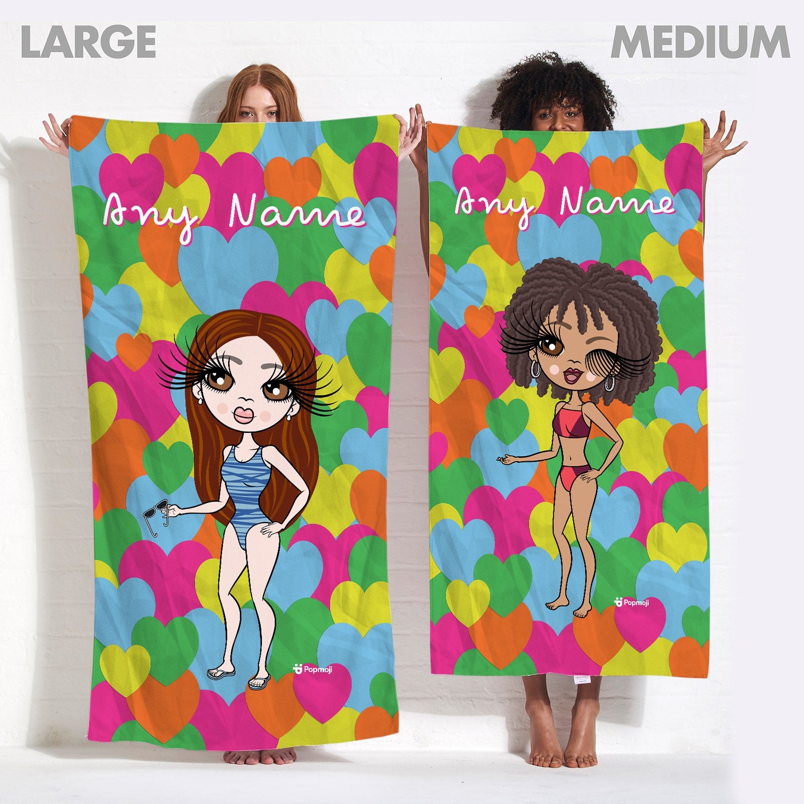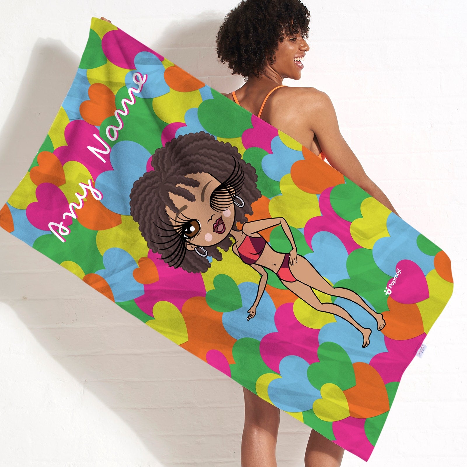 This fab beach towel features bright coloured confetti love hearts design background. Your personalised character, name or personal text will appear largely on the front of the towel.