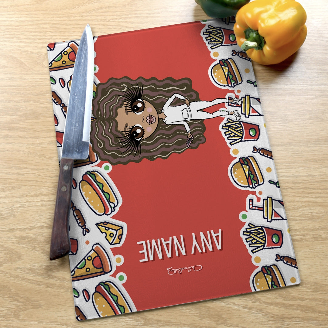 Add this funky addition to your little chefs kitchen essentials, personalised ClaireaBella Girls Glass Chopping Board featuring your created character at the centre of this funky fun fast food design.