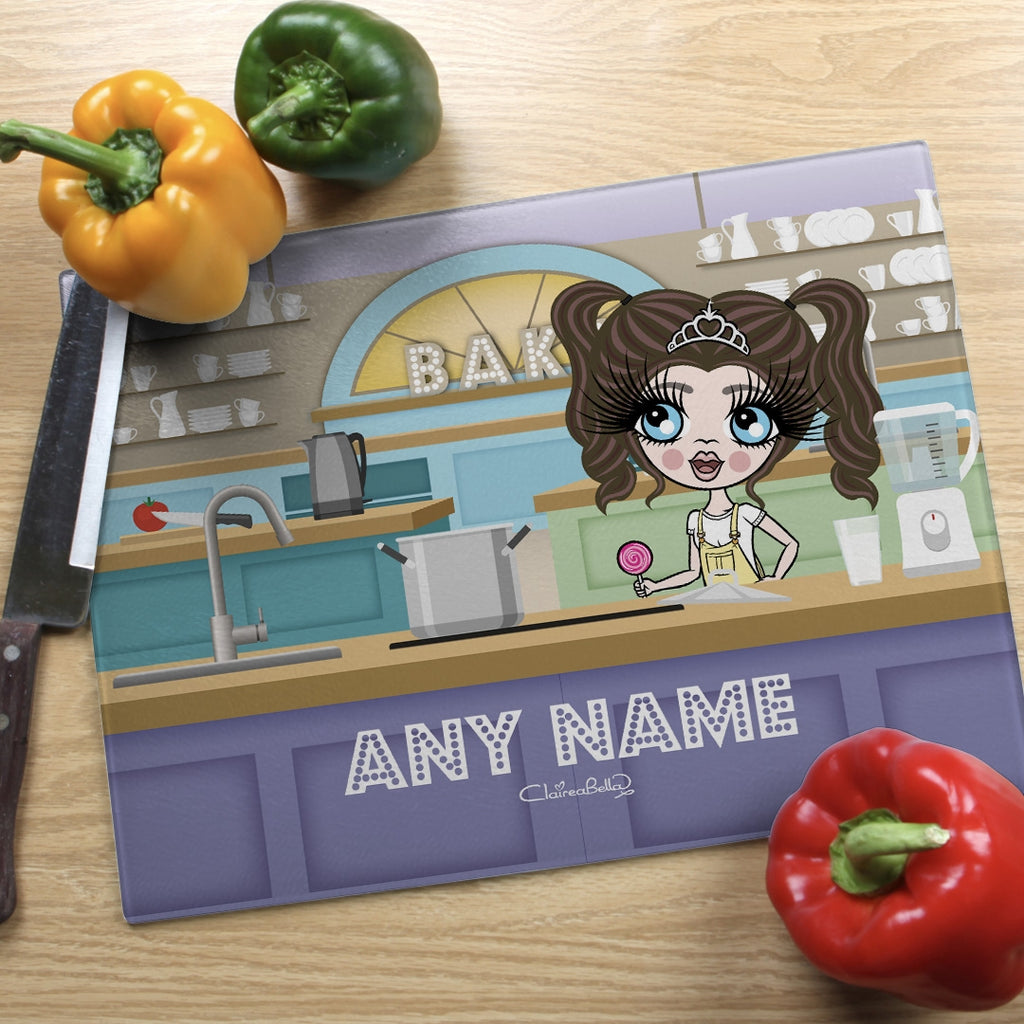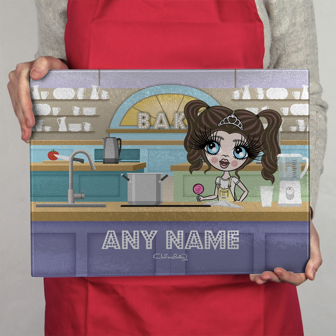 Let's get competitive little baking divas with the personalised ClaireaBella Girls Glass Chopping Board featuring your created character at the centre of this fantastic baking competition kitchen scene design.