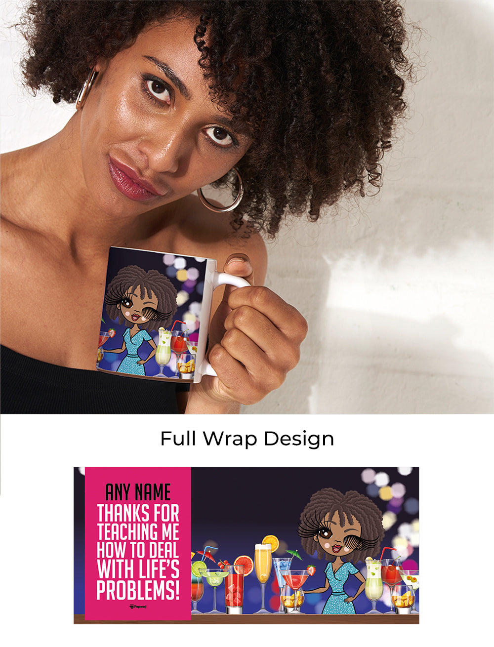 Treat mum to a nice cuppa by making it super fun and personal, with the ClaireaBella Mug, featuring YOUR created character in the style of ClaireaBella at the centre of this fun-loving 'Thanks for teaching me, how to deal with life's problems' cocktails design.