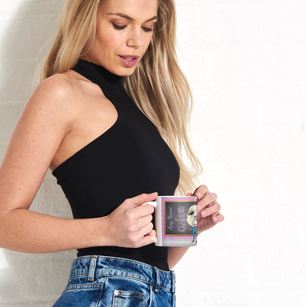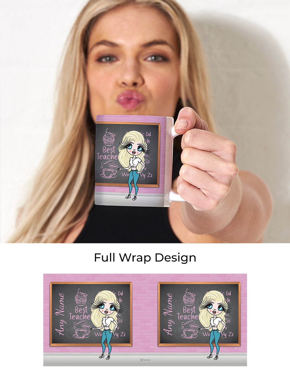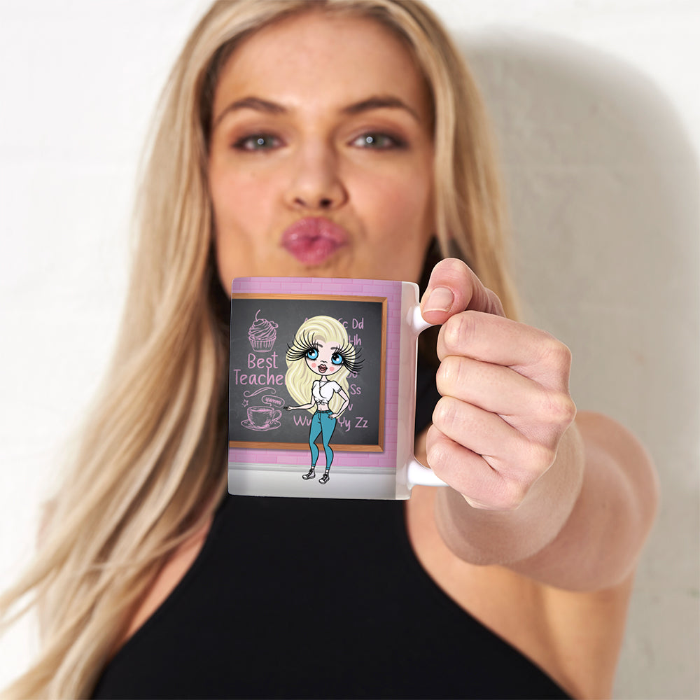 The ClaireaBella Best Teacher Mug has a pink classroom background with a chalkboard saying "Best Teacher”, Personalise by creating your ClaireaBella character to look just like your teacher.