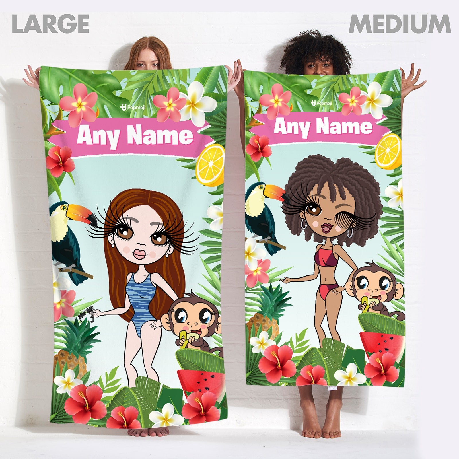 Head into summer with ClaireaBella and have some tropical fun! - with the fully personalised ClaireaBella Beach Towel featuring YOU at the centre of this bright, bold tropical design and a cute little tropical monkey