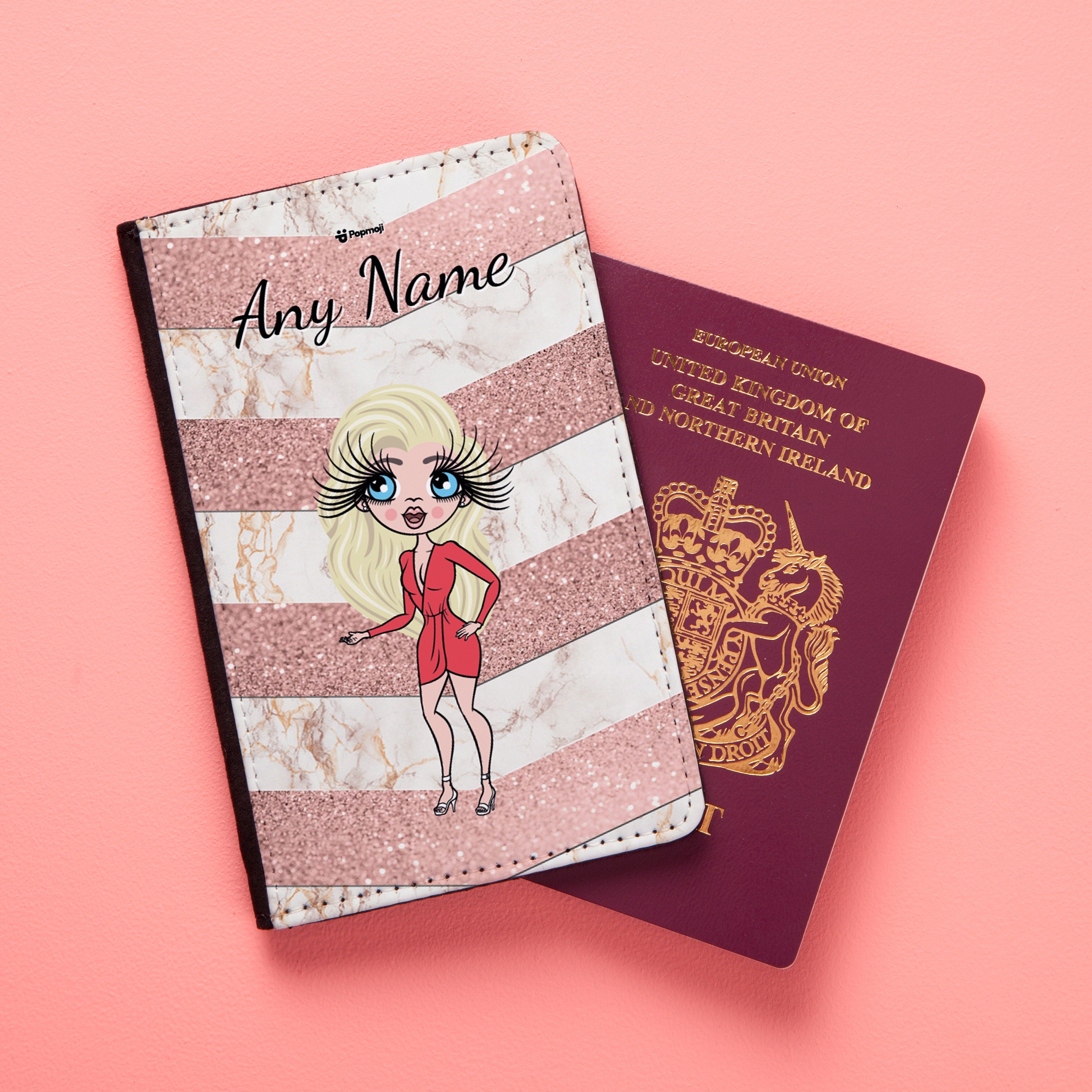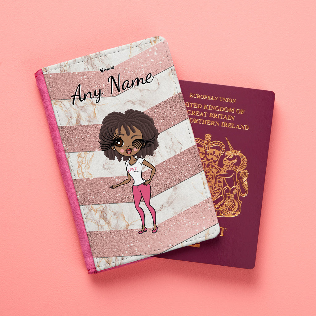 Travel in true ClaireaBella style,with this stylish new ClaireaBella passport cover. This fab passport cover features your created ClaireaBella Character and name, on this stylish Marble and peach glitter effect Chevron print background