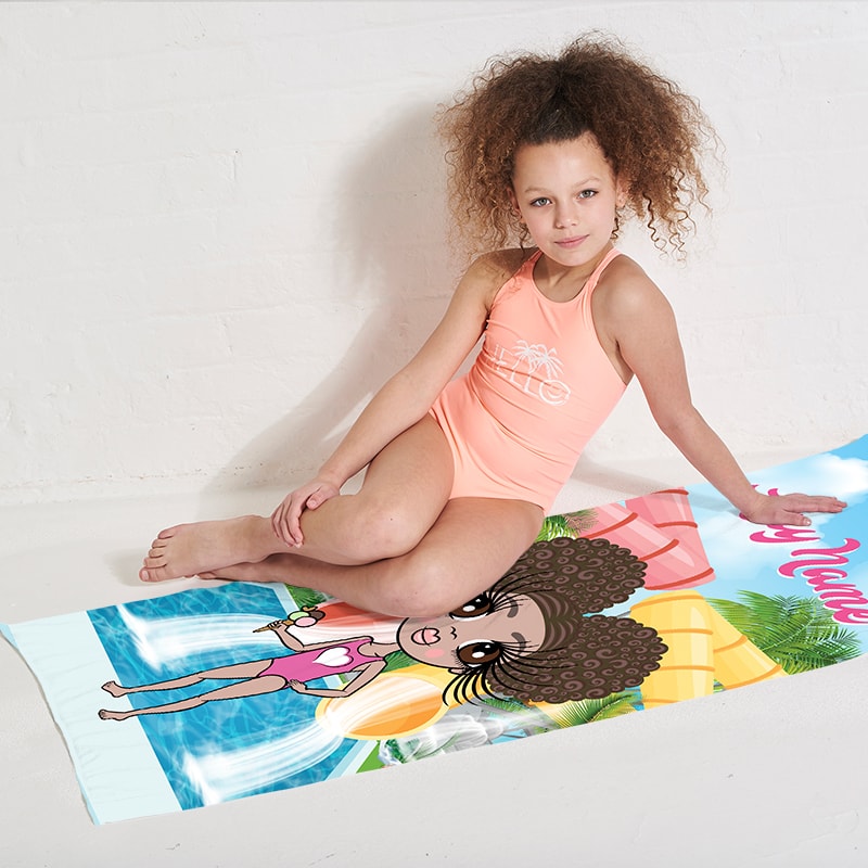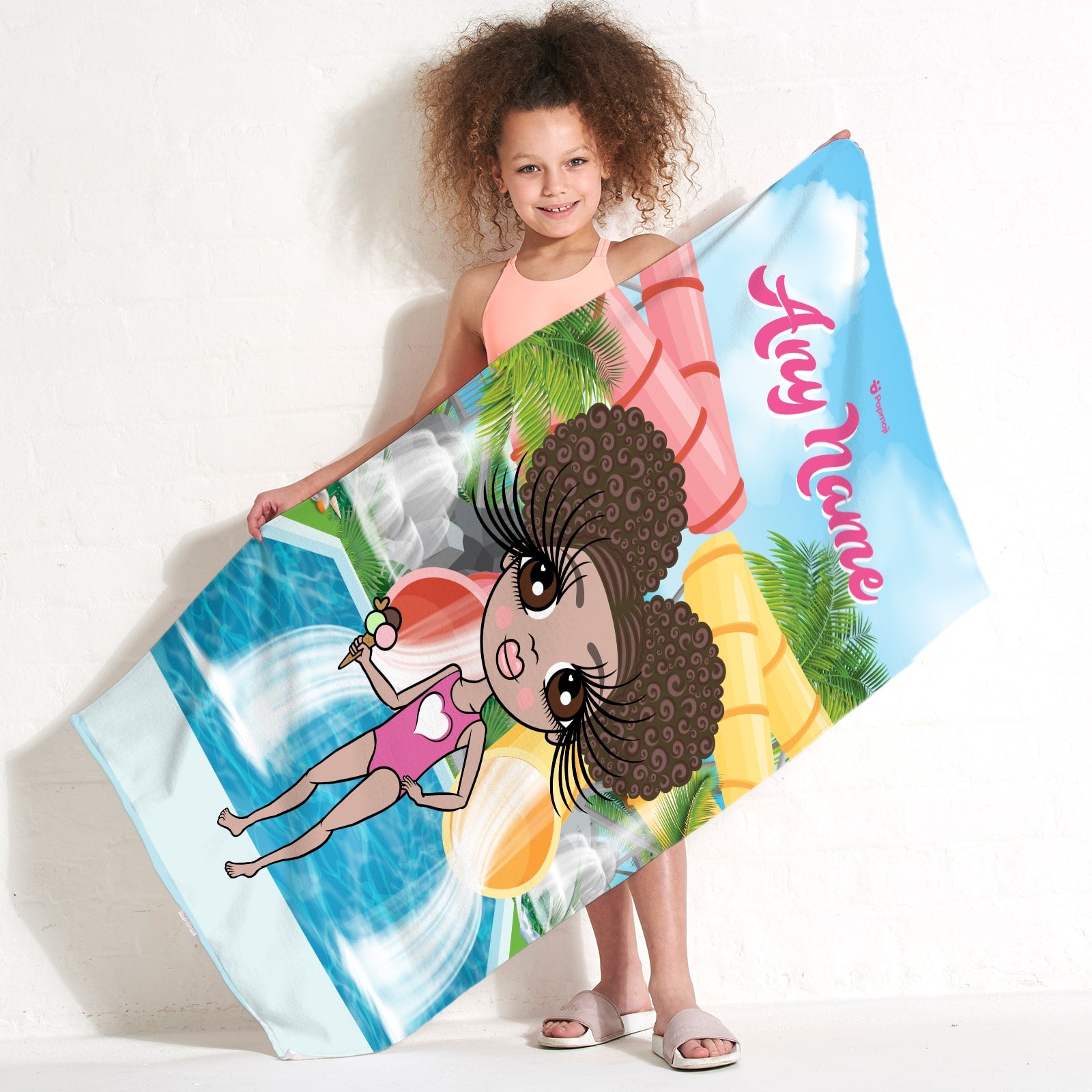 Make a statement at the pool or by the sea, with the brand new ClaireaBella Girls Aqua Park beach towel. This fab beach towel features you on a water theme park design. Your personalised girls character and personal text will appear largely on the front of the towel.