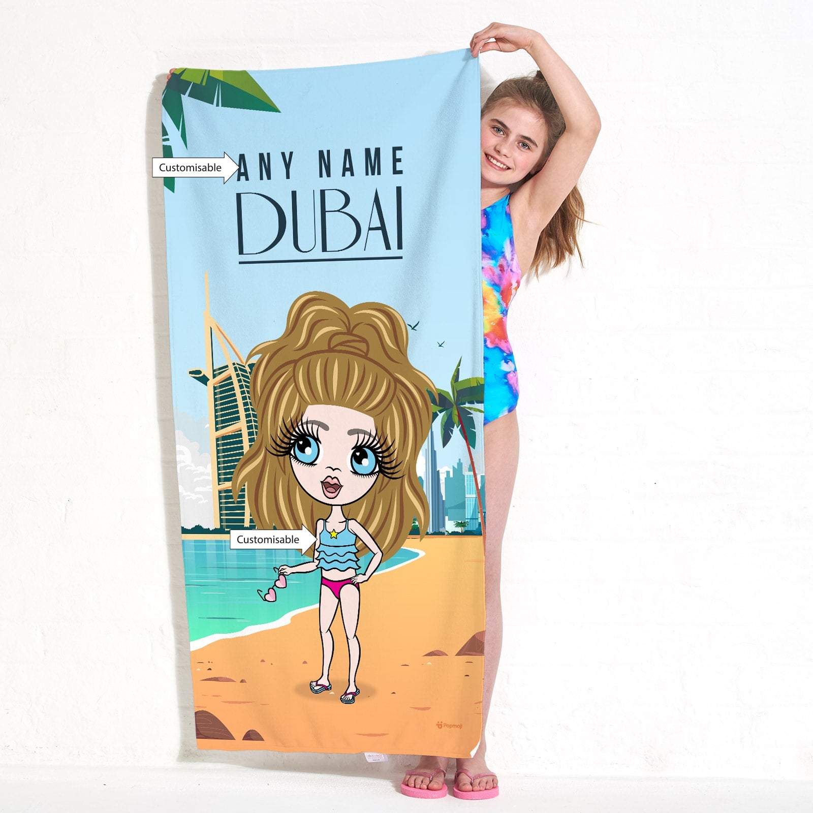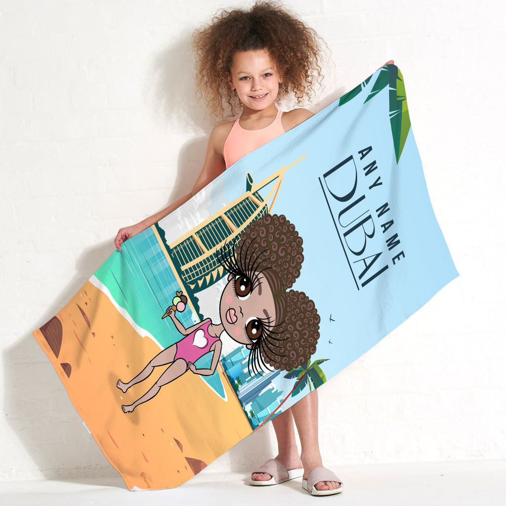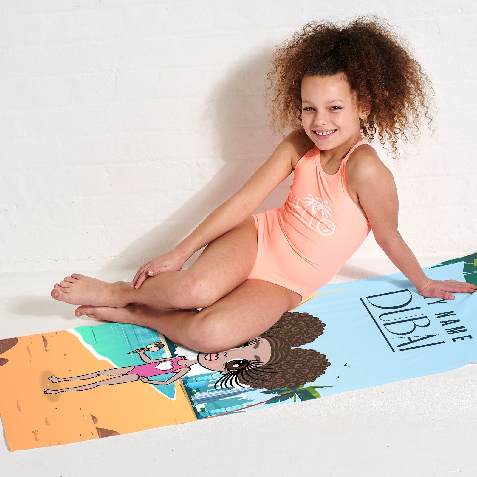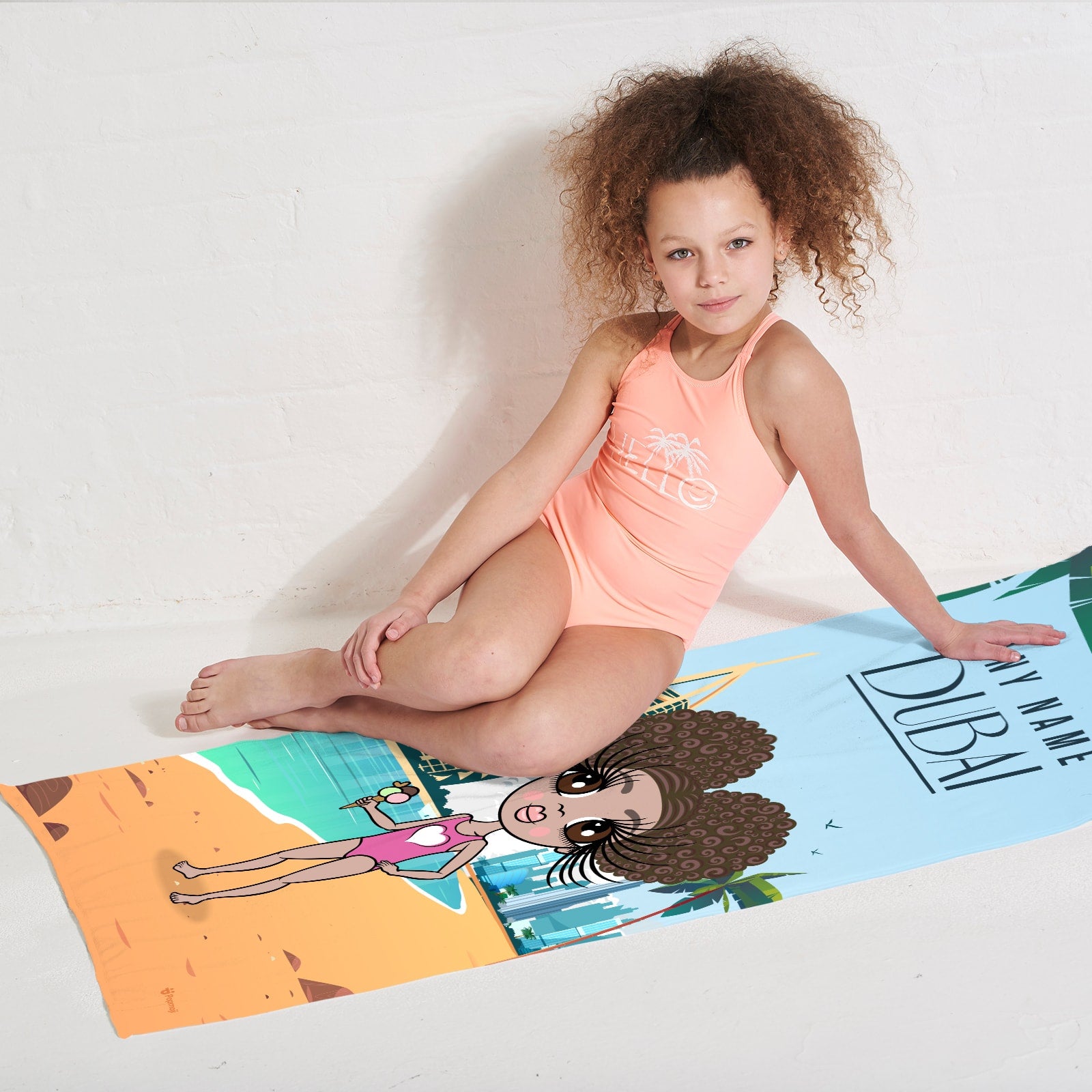 Time to head to the beach or pool with their very own Personalised ClaireaBella Girls Beach Towel, with your created character at the centre of this funky & cute design.