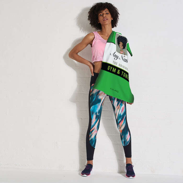 Featuring your created character on a funky green and white design with the quote 'Gym & Tonic'.