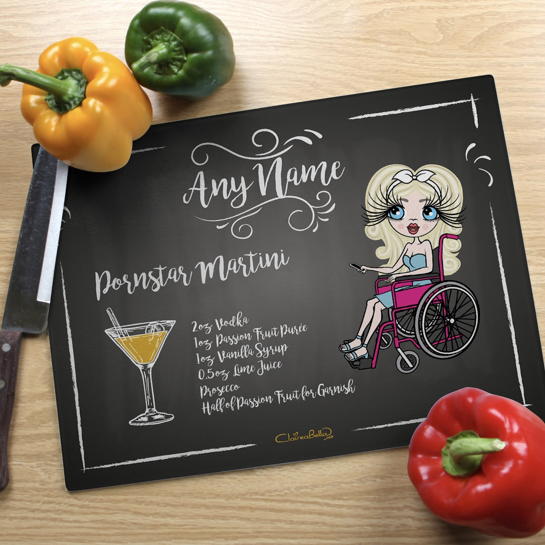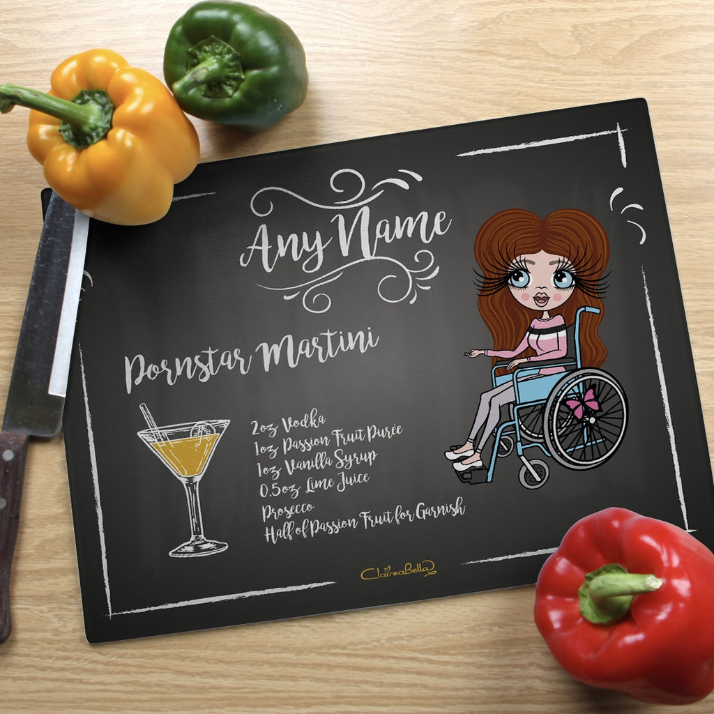 Add this tasty addition to your kitchen with your very own personalised ClaireaBella Glass Chopping Board featuring YOU at the centre of this delicious pornstar martini recipe design, along with your own super cool custom designed wheelchair.