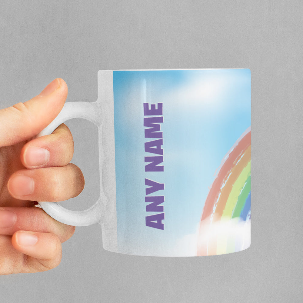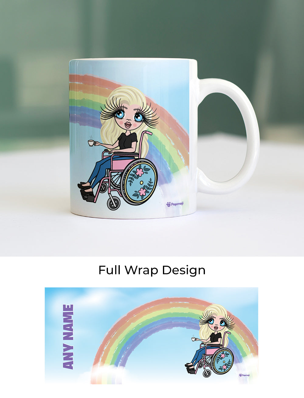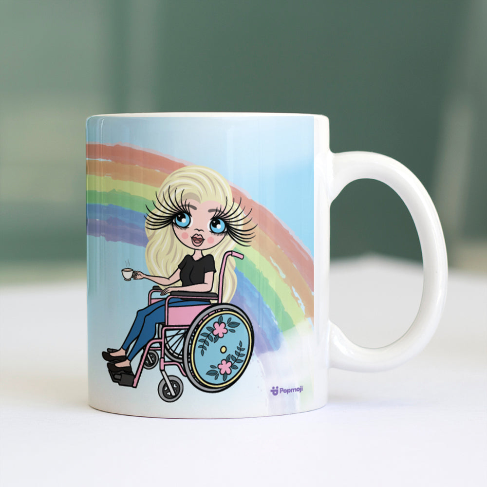 Time to sit down with a cuppa in true unique style with the personalised ClaireaBella Mug, featuring your created character in a cute inspirational rainbow design, along with your custom design wheelchair.