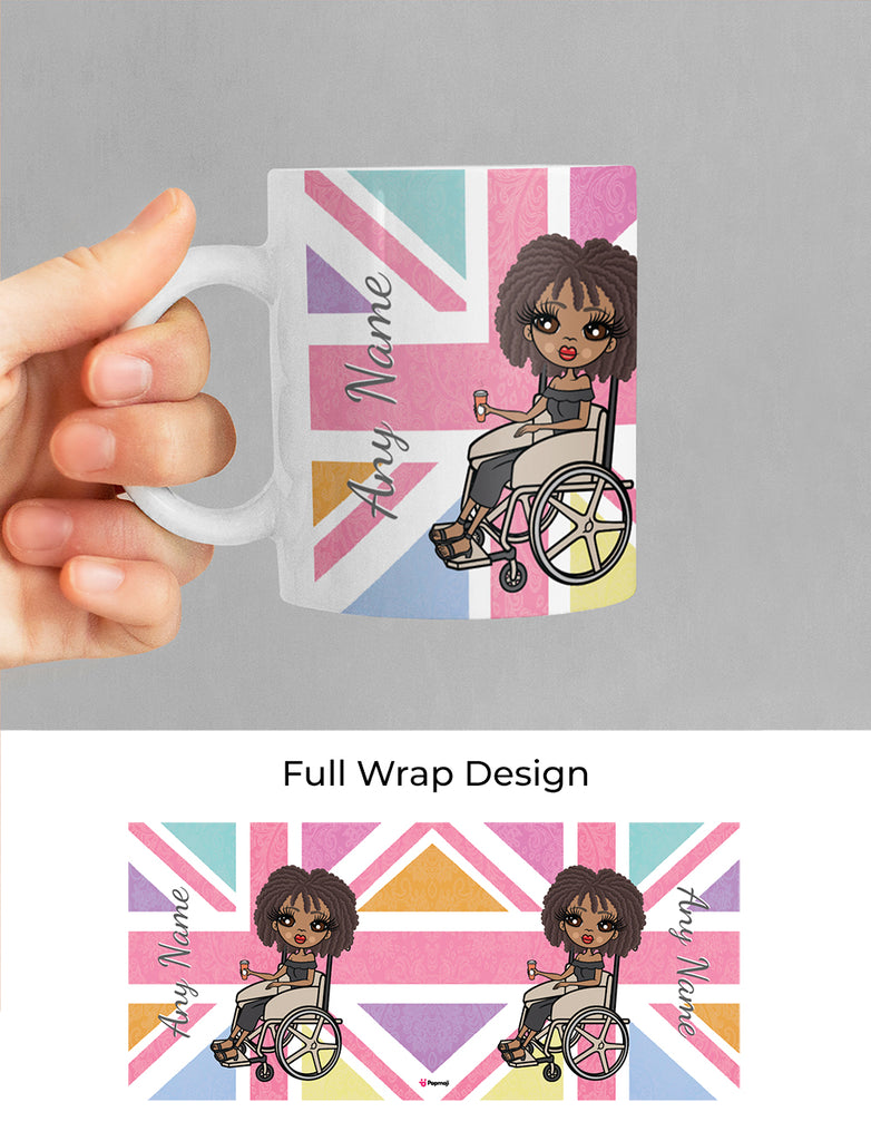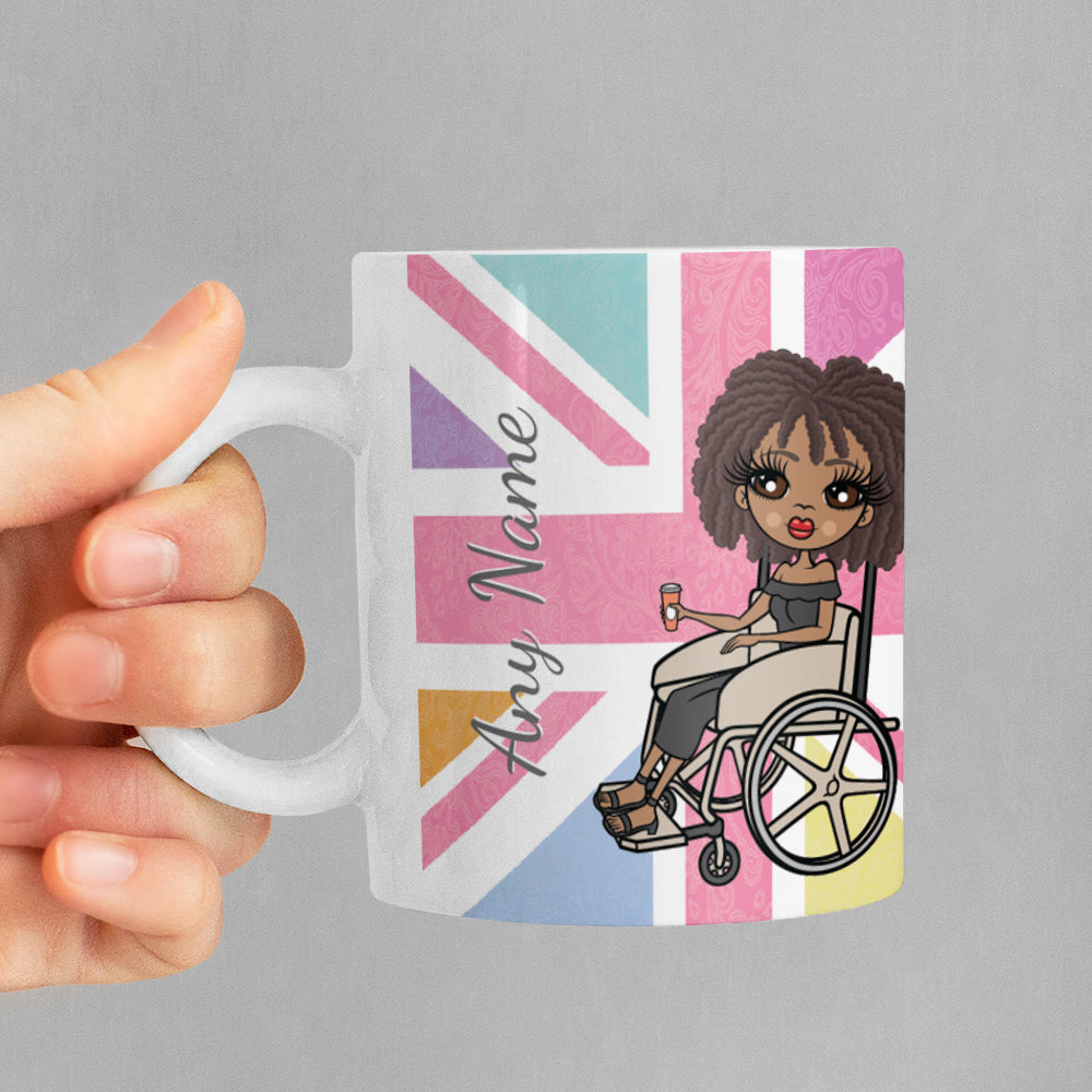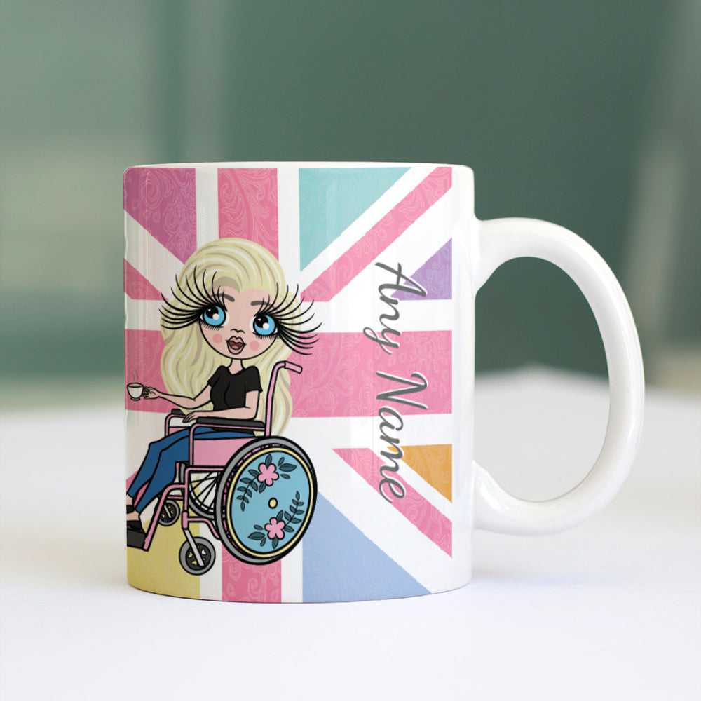 Time to sit down with a cuppa in true unique style with the personalised ClaireaBella Mug, featuring your created character in a cute pastel colours union jack design, along with your custom design wheelchair.