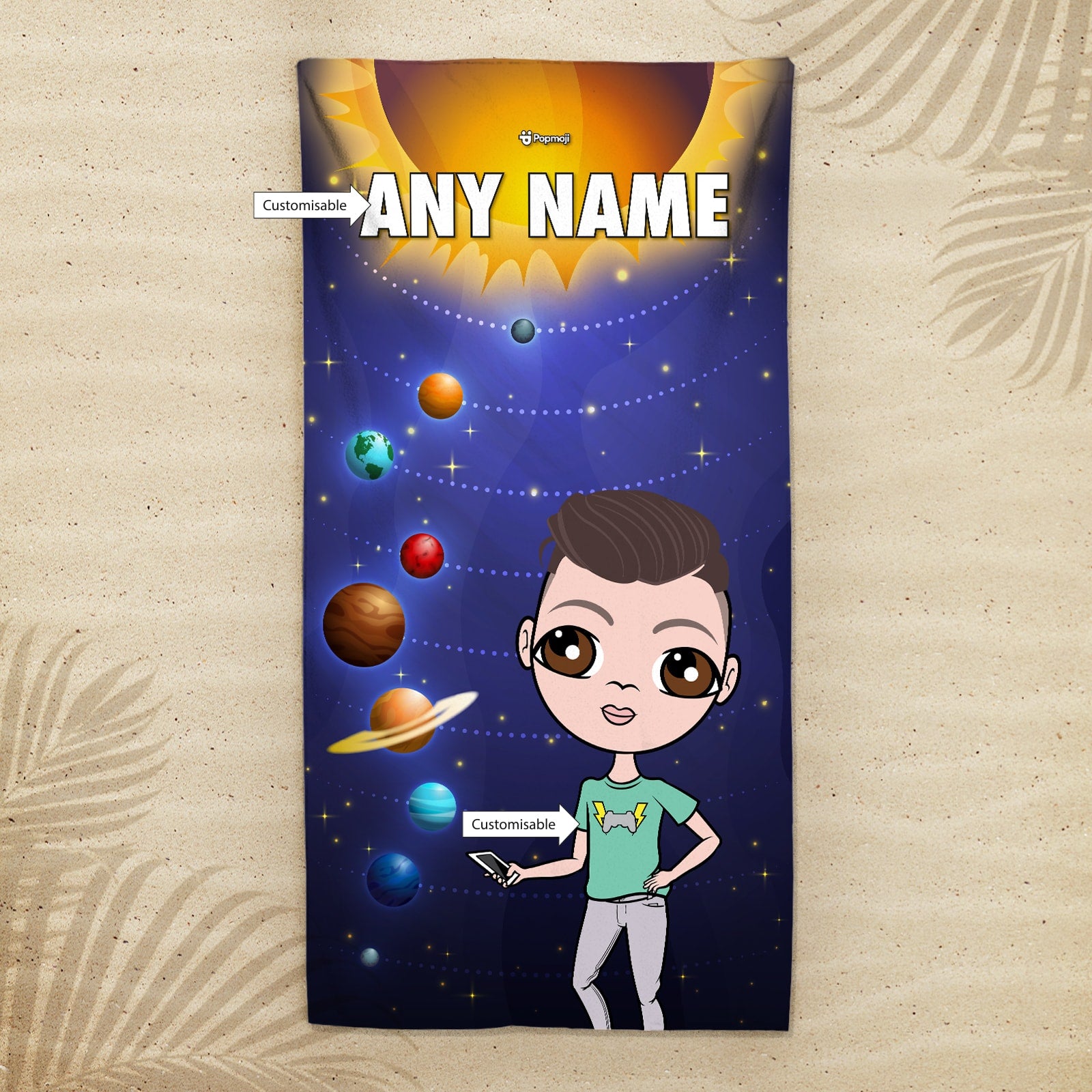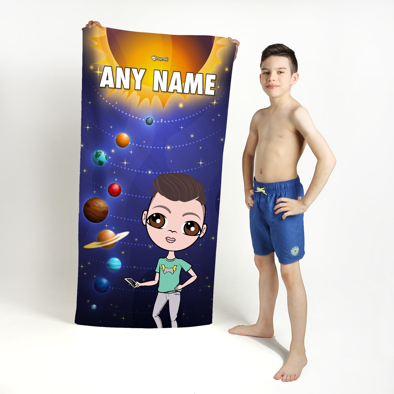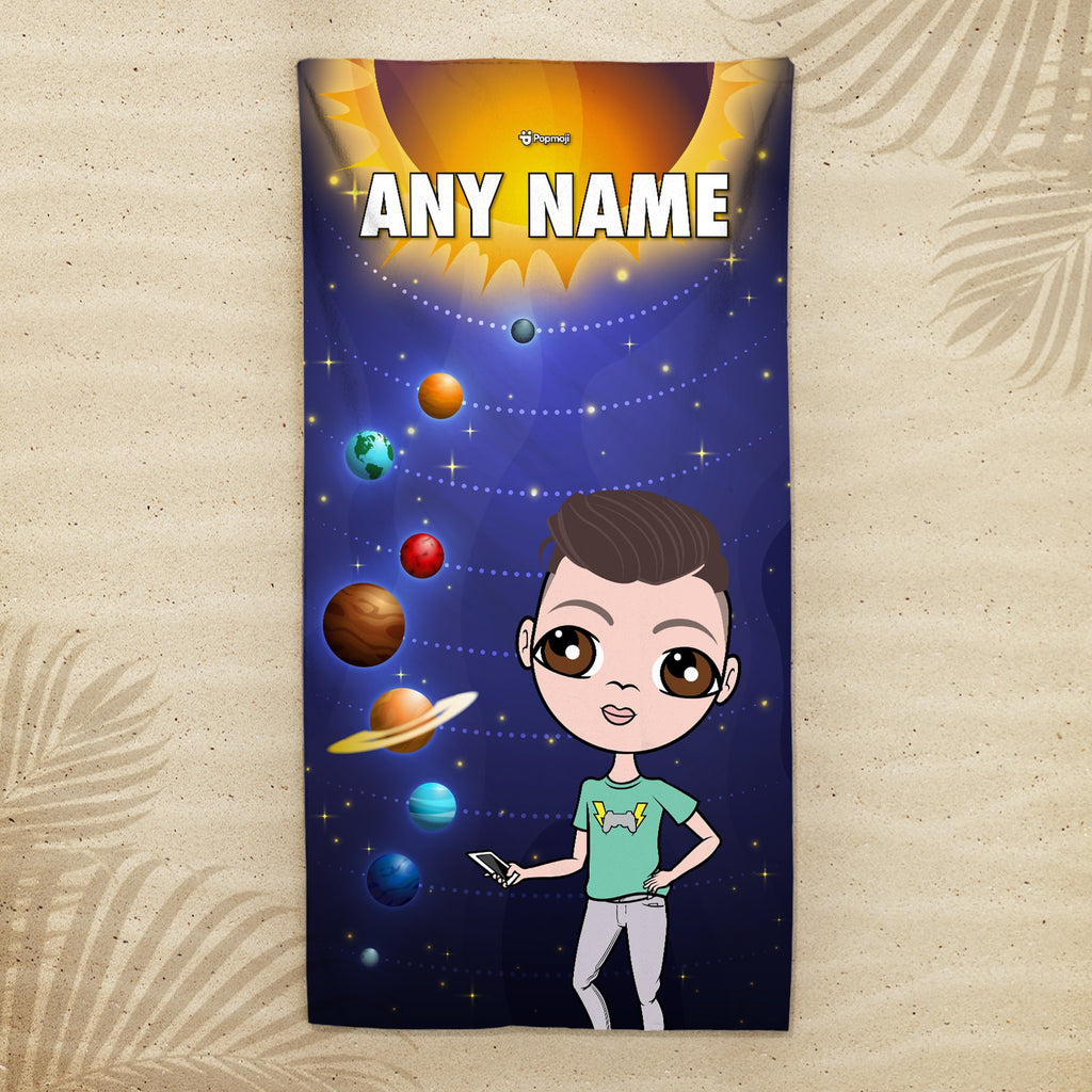 Head into out of space with your very own Jnr Boys Beach Towel, featuring your created character on this out of this world space galaxy solar system design.