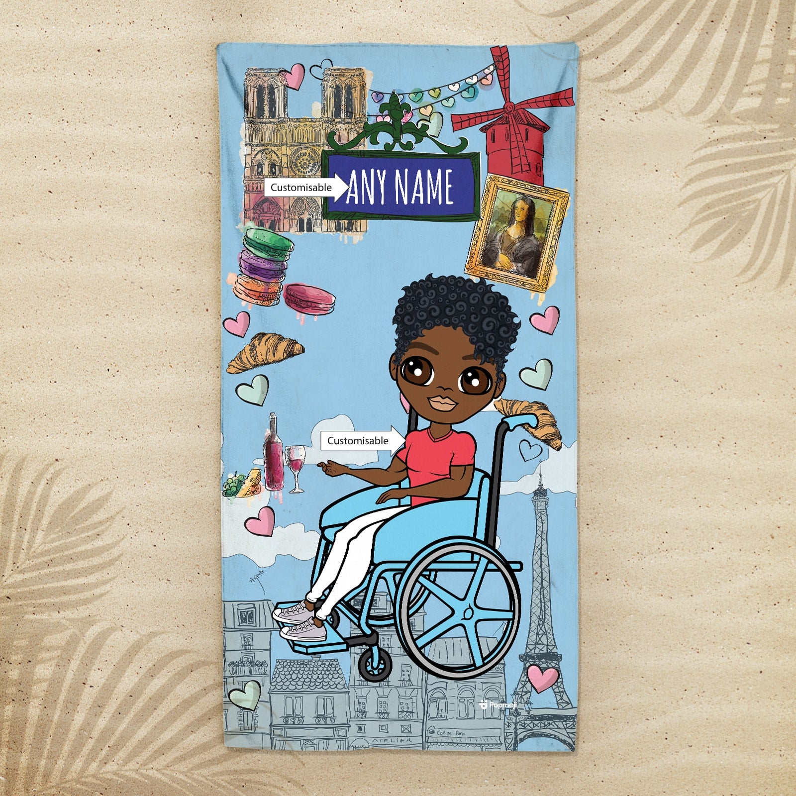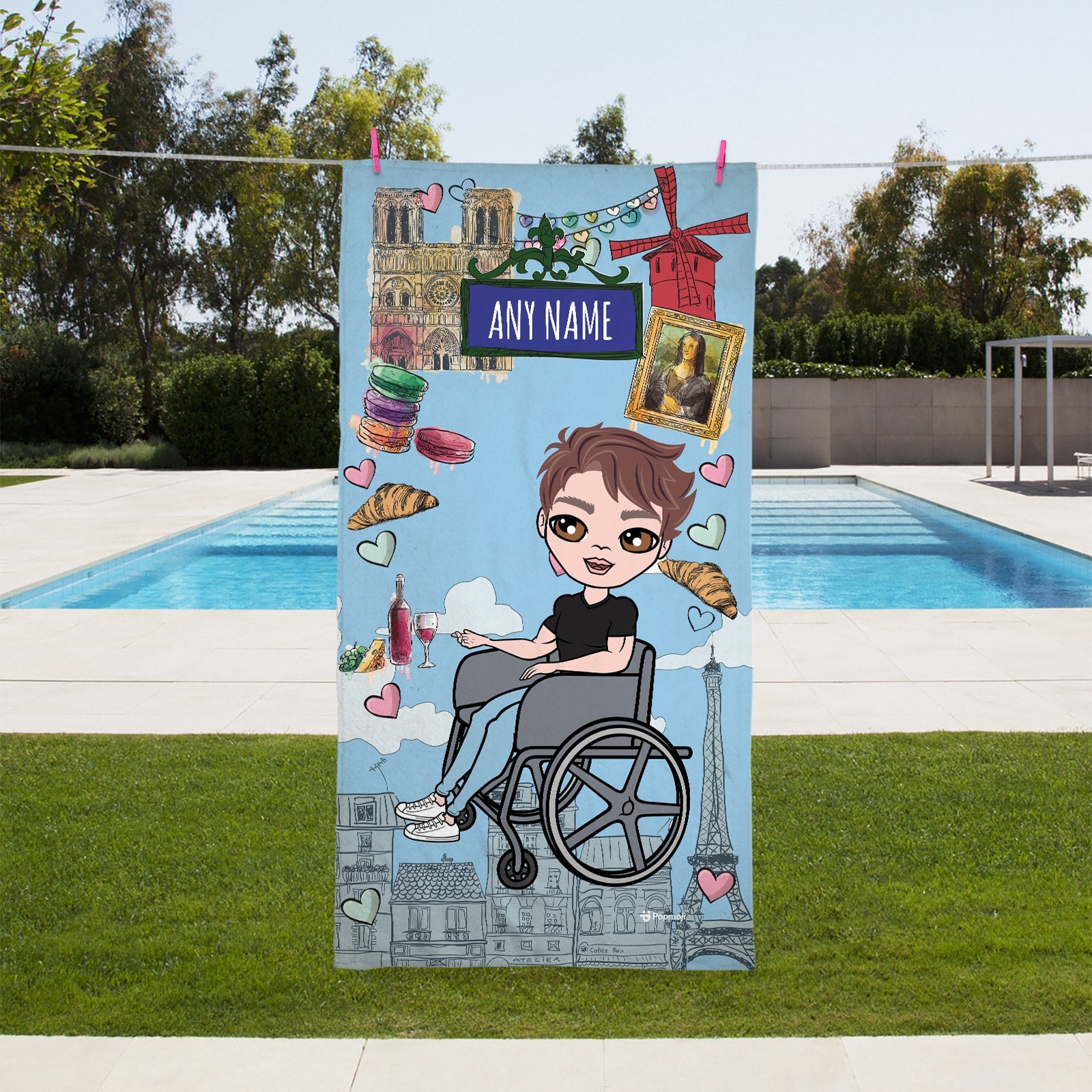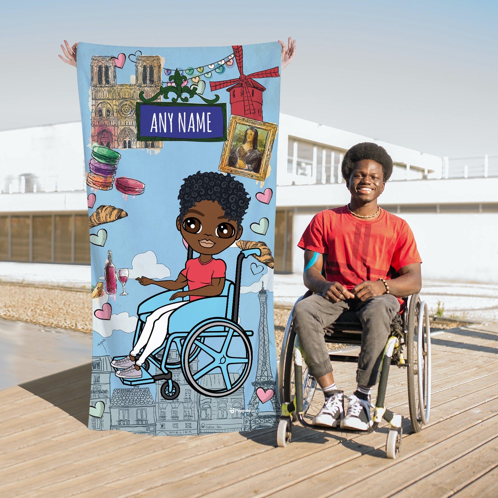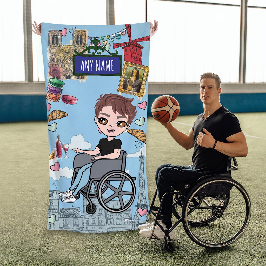 Jet set in true MrCB style! With the new MrCB Beach Towel, featuring YOU in the centre of this cool Love Paris design, along with super cool custom wheelchair.