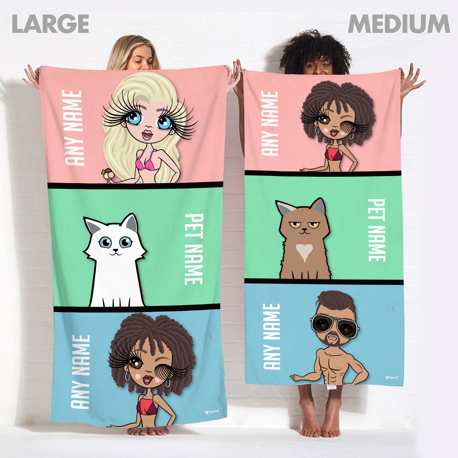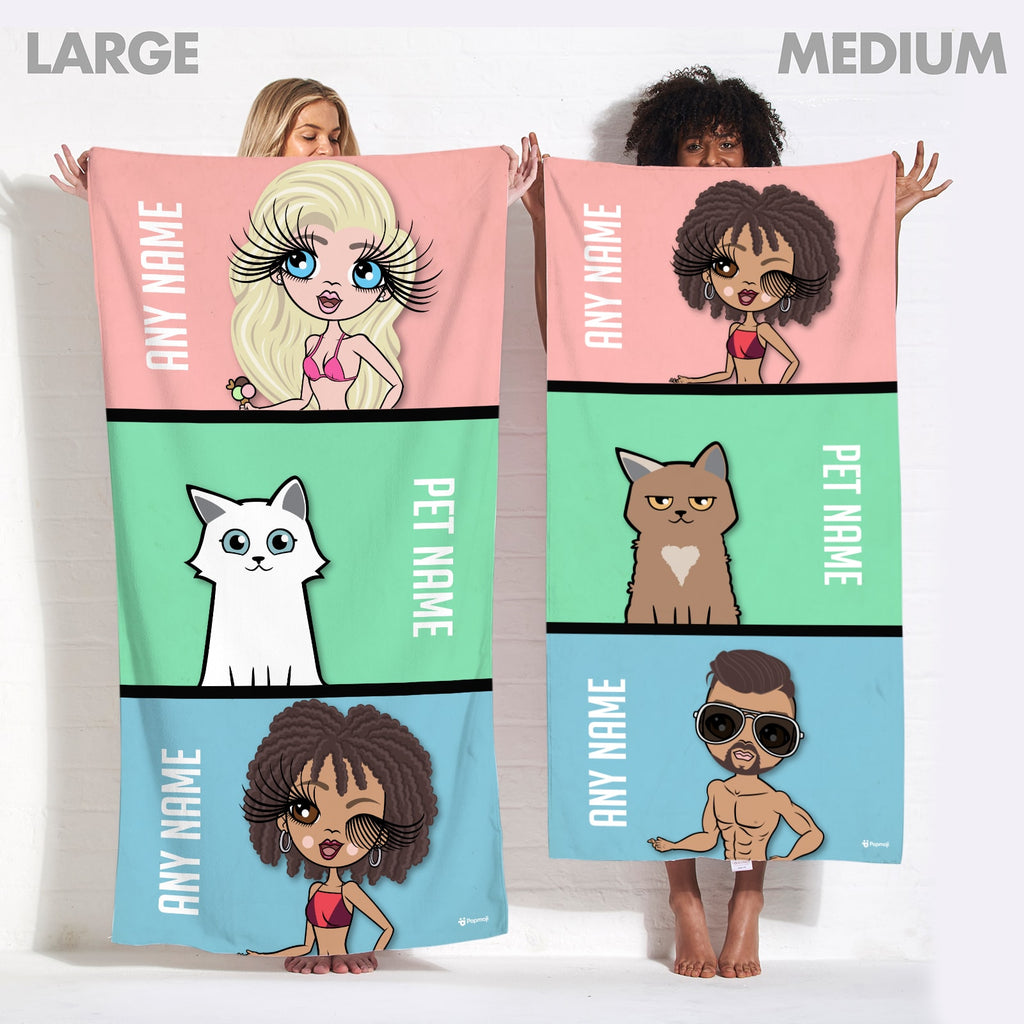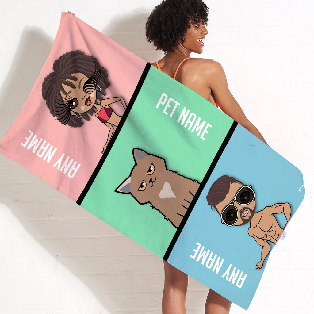Brand new and exciting fully personalised Multi Character beach towels! The fabulous new Multi Character Beach Towel, allows you to create & personalise each character including a your cute furry cat friend, to appear on this funky, fun & bold design!